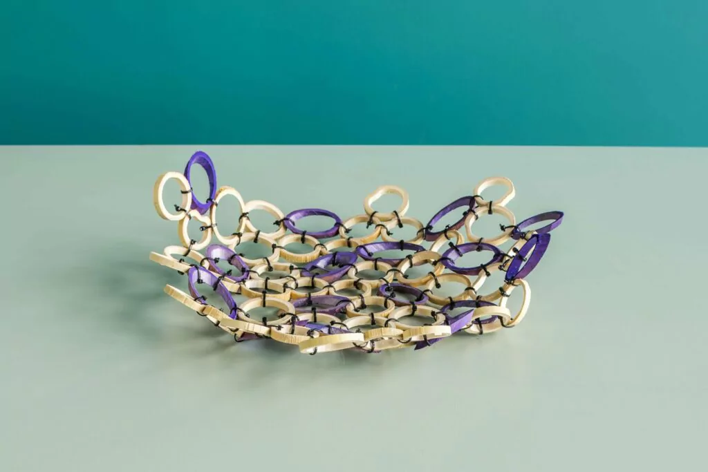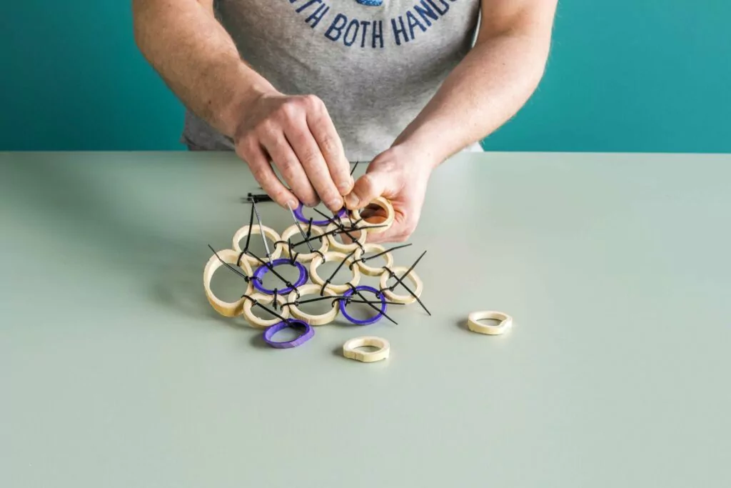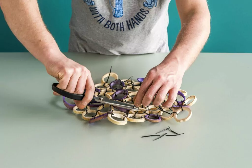 Bundel alle houten ringetjes en bind ze aan elkaar met de spanbandjes. Geef je creatie een ronde vorm. Hou enkele houten ringetjes over. Knip de eindjes van alle spanbandjes kort.