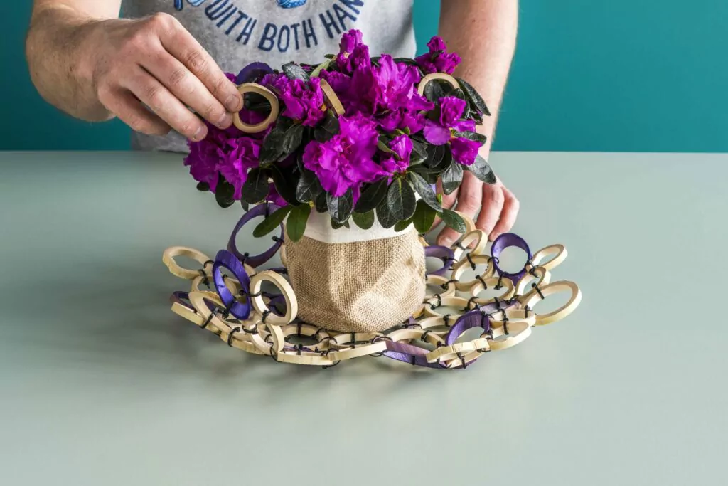 Zet de azalea in de jutezak en plaats deze op je creatie. Neem de overige houten ringetjes en steek ze door de uitstekende takjes van de azalea.